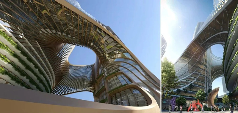 扎哈事務所的設計旨在創造一個新的地標,一組新的可識別的塔,讓建筑本身成為一個公共事件。方案完美地回應了深超總城市規劃設計的“十字生境”理念,并與周邊的公園和廣場建立了直接的聯通關系——裙房梯田狀的空間形態將中央綠軸自然地引入裙房公共空間,提供直接的連續感,并通過塔樓設計使該空間不斷上升,使建筑整體與綠軸景觀無縫連接。