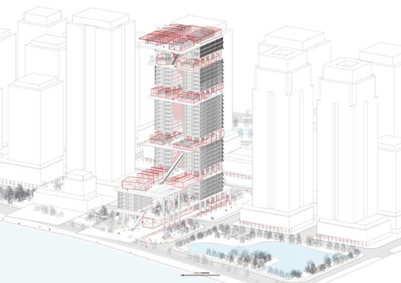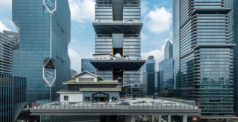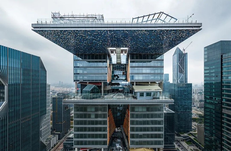 其標志性設計包括4道單邊懸挑景觀平臺,形似“火箭發(fā)射臺”,創(chuàng)下國內超高層直挑結構首例。