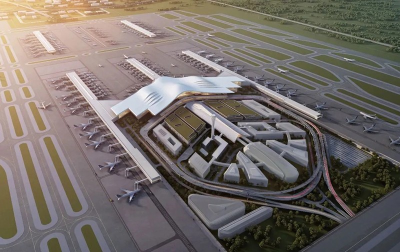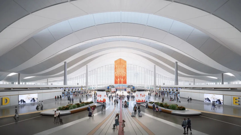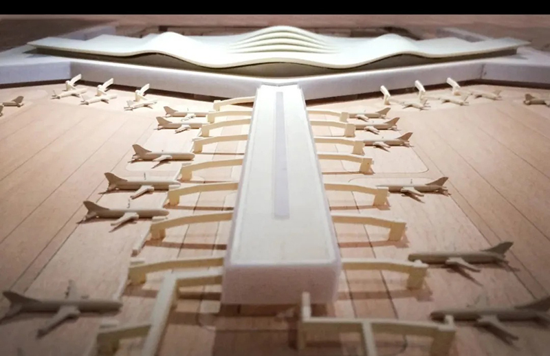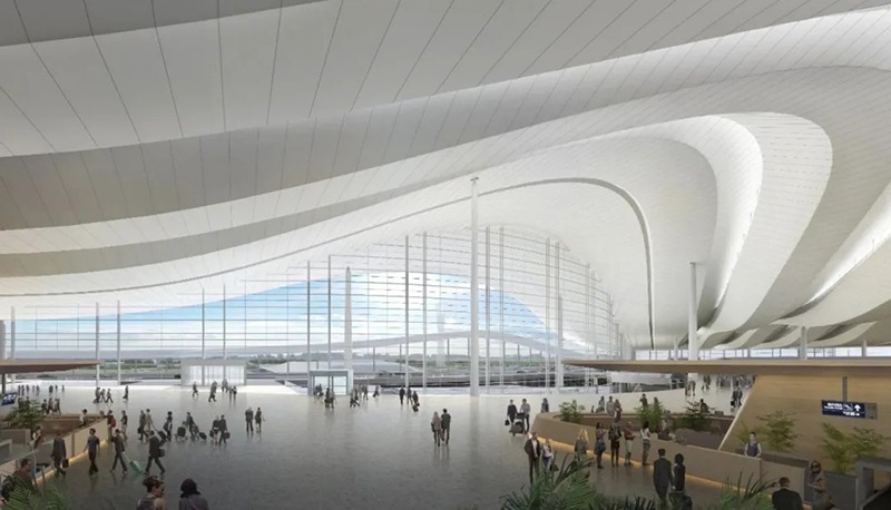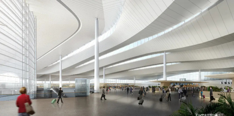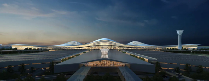 烏魯木齊天山國際機場的擴建工程是國家“十三五”“十四五”重點建設項目,總投資約520億元,規劃建設兩條4F級跑道、50萬平方米的T4航站樓、177個停機位及綜合交通中心等設施;航站區采用“主樓+三指廊”構型,地上四層、地下一層,可容納年旅客吞吐量3500萬人次,貨郵吞吐量55萬噸
