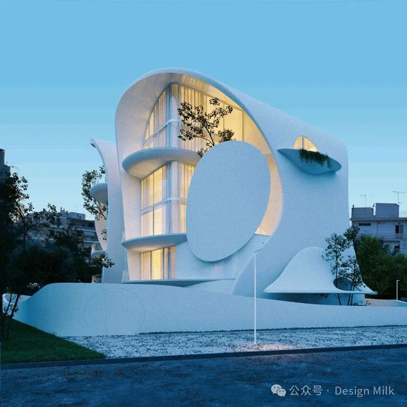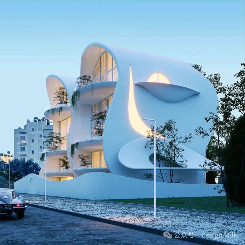 外表面光滑、潔白,加上精心布置的燈光,凸顯了建筑復(fù)雜的輪廓。 設(shè)計中融入了大型圓形開口和彎曲的陽臺,可以看到室內(nèi)景象,并提供與外部無縫融合的室外空間。 這些陽臺上裝飾著綠色植物,不僅增添了一絲自然氣息,也增強了建筑的有機美感。 整體效果既具有未來感又不失自然,營造出強烈的視覺沖擊。