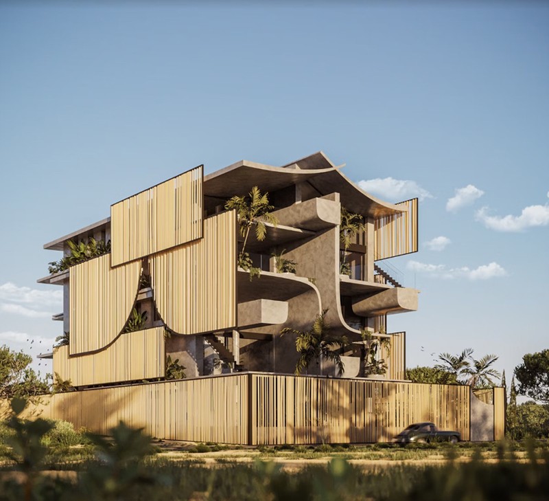 屋頂呈波浪狀起伏,這不僅為建筑增添了獨特的建筑特色,還反映了自然形態,其靈感源自海浪和連綿起伏的地貌。對天然材料的重視、綠植的融入以及有機的形態,都體現了親生物的設計理念。這種設計哲學旨在讓居住者更緊密地與自然相連,促進身心健康和可持續發展。木質板條的使用以及開放、通風的設計,顯示出受到了熱帶建筑風格的影響,熱帶建筑常常會融入一些元素來散熱和增強通風效果。