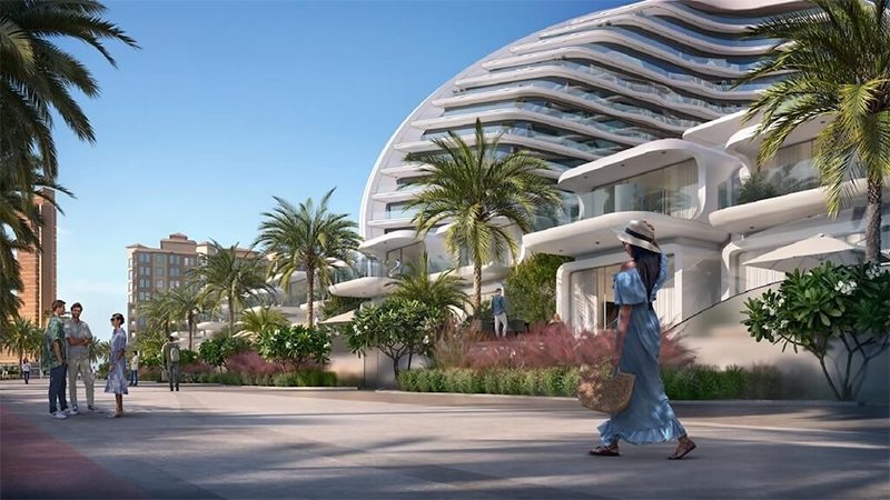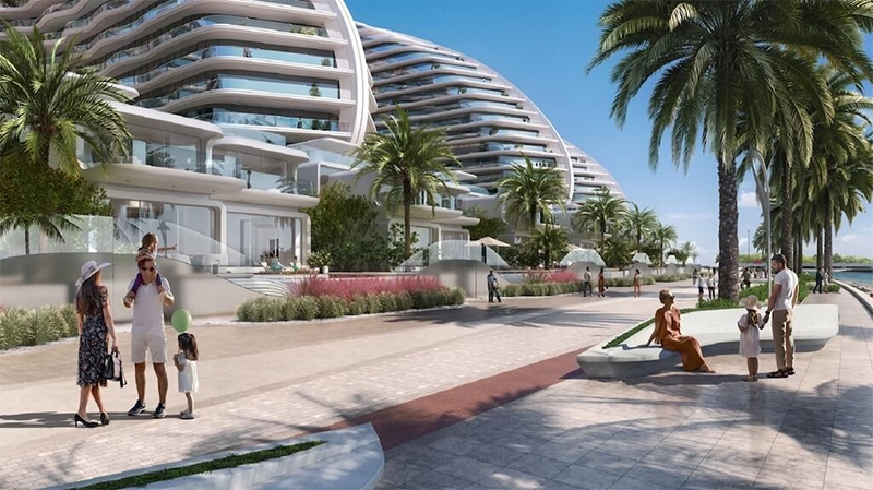 Oystra 同時(shí)融合商業(yè)與休閑功能,設(shè)置有購(gòu)物長(zhǎng)廊、餐飲區(qū)和健身娛樂(lè)中心。整個(gè)開(kāi)發(fā)項(xiàng)目與 Al Marjan 島的濱海長(zhǎng)廊無(wú)縫銜接,綠樹(shù)成蔭、海風(fēng)拂面的步行系統(tǒng)讓居民可輕松通達(dá)島嶼各處。此外,項(xiàng)目引入海水冷卻系統(tǒng)與隔熱雙層外立面,有效應(yīng)對(duì)高溫氣候,降低運(yùn)營(yíng)能源負(fù)荷。